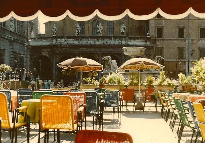 Nell’83 ripetemmo il viaggio a Roma, questa volta includendo anche Vanessa, e fummo ospiti di Fiorella e Toni, con i quali (oltre a mia madre) si andò a villeggiare al mare a San Felice Circeo, all’hotel Punta Rossa. Mariella era single-mother con una bimba che chiamò Mia (il padre che avevo conosciuto qualche anno prima, era morto di un infarto), e affittava una casetta estiva a Ostia, dove portava anche mamma. Le figlie venivano coperte di attenzione e di regali, Beth faceva compre di souvenir, e io sempre a dipingere o a fare il turista o ritrovando vecchie amicizie. Giancarlo Croce, Carlo Ambrosoli, Gilda Pizzolante, ritrovai perfino Romoletto D., compagno all’istituto d’arte che tanto mi aveva impressionato, chi viveva ancora nello stesso seminterrato.