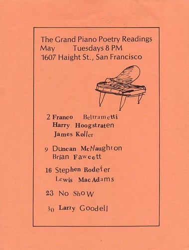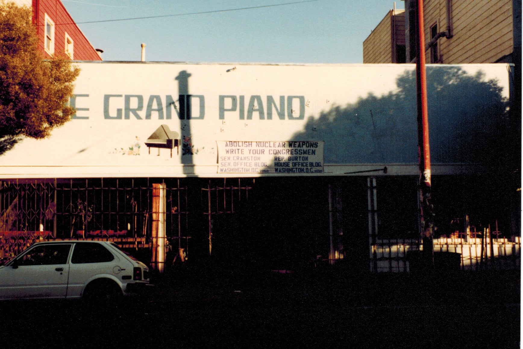 La proprietaria del Grand Piano, una donna Tedesca di nome Lexie, più anziana, divorziata con due figli maschi intorno ai vent’anni, mi promosse manager quando il locale si spostò al lato opposto della strada, in un locale molto più grande. Avevamo una bella macchina per il caffè e si vendeva tè, dolci, torte, e diversi panini e insalate. Nella grande sala adornata di tavolini e sedie, c’era un pianoforte, sul quale Lexie invitava gente a suonare. Solo musica classica! E solo fogli scelti da lei. Era una seguace di Rudolph Steiner e della Società Teosofica, di carattere molto forte e autoritario. Di rimpetto a noi c’era un ristorante (The Panhandle Pantry) operato da Robert Clutton, un pittore sui cinquant’anni, di origine Gallica, al quale piaceva bere, oltre al cucinare, dipingere e dare feste. Robert lo avevo conosciuto perché era il proprietario di una grande mansione vittoriana a tre piani, 4 quadre più su (in salita) per Ashbury street, casa dove affittava stanze, e ci vivevano due o tre miei amici. C’erano diverse scale che portavano in diverse suddivisioni dell’interno. Lui occupava il terzo piano per intero. Nello scantinato aveva una sala da gioco con tavolo da biliardo, un vecchio jukebox e il suo studio, con porte che davano su un bel giardino a vari livelli, con tante piante e fiori. Si era fatto costruire una piccola serra/sauna con una vasca, e con porte di vetro che davano sul giardino. Era un personaggio ben noto nel quartiere, simpatico e molto benvoluto. Capita la concorrenza, divenne socio con Lexie aprendo la sua cucina al Grand Piano, così da semplice caffè, diventammo un ristorante. Io avevo il mio da fare, assumendo nuovo personale, creando gli orari di lavoro, e generalmente la supervisione del da fare quotidiano del locale. La mattina presto andavo ad aprire e mentre arrivavano gli impiegati, lavavo il marciapiede con un tubo dell’acqua… Si accendeva la macchina del caffè e cominciava il via vai dei clienti, mentre il quartiere si svegliava lentamente.